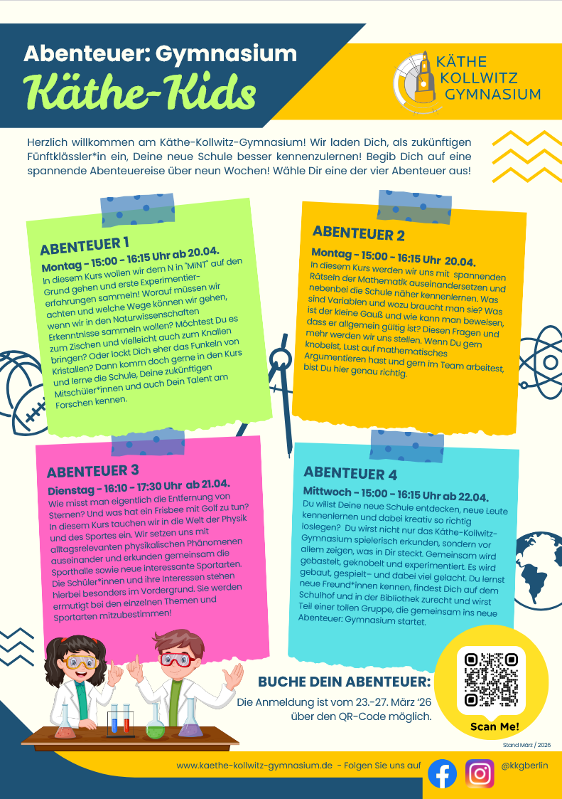 Herzlich willkommen am Käthe-Kollwitz-Gymnasium! Wir laden dich, als zukünftigen Fünftklässler*in ein, deine neue Schule besser kennenzulernen! Begib dich auf eine spannende Abenteuereise über neun Wochen! Wähle dir eine der vier Abenteuer aus!