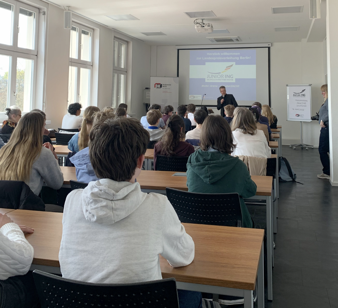 Karlotta Düsterhöft (10.3) und Finn Schwarz (10.1) haben beim Landeswettbewerb Junior.ING der Baukammer Berlin in der Altersklasse 2 (ab 10. Klasse) den 1. Platz belegt. Mit ihrem Modell „Schalenwerk“ werden sie Berlin am 13. Juni beim Bundesfinale im Technik-Museum vertreten. Das KKG war noch mit zwei weiteren, ebenfalls sehr gelungenen Modellen im Wettbewerb vertreten: Vasilii Beliaev und Henri Jungclaussen (8.2) in der Altersklasse 1, Julika Mohs, Nella Nowak, Paula Scharnefsky, Carl Wegener und Alwin Ettner (10.3) in der Altersklasse 2.