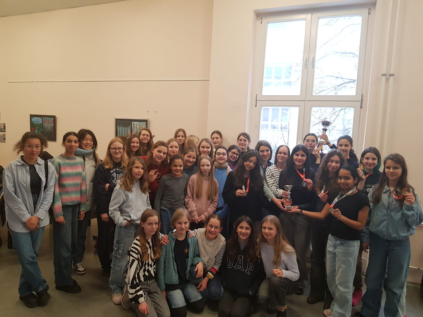 Die WK M stand unter besonderen Vorzeichen. Wir traten mit sage und schreibe sieben Teams an. Damit stellten wir die Hälfte des Teilnehmerfeldes! Die Teams Käthe-Kollwitz 1 und 2 erreichten die ersten beiden Plätze. Als Krönung gewann Kollwitz 1 nicht nur jeden Kampf sondern auch jede einzelne Partie! Unser neues Flaggschiff verspricht einiges für die Zukunft. Unser Gruppenfoto mit ca. 40 Mädchen wurde von der Konkurrenz mit Staunen registriert.