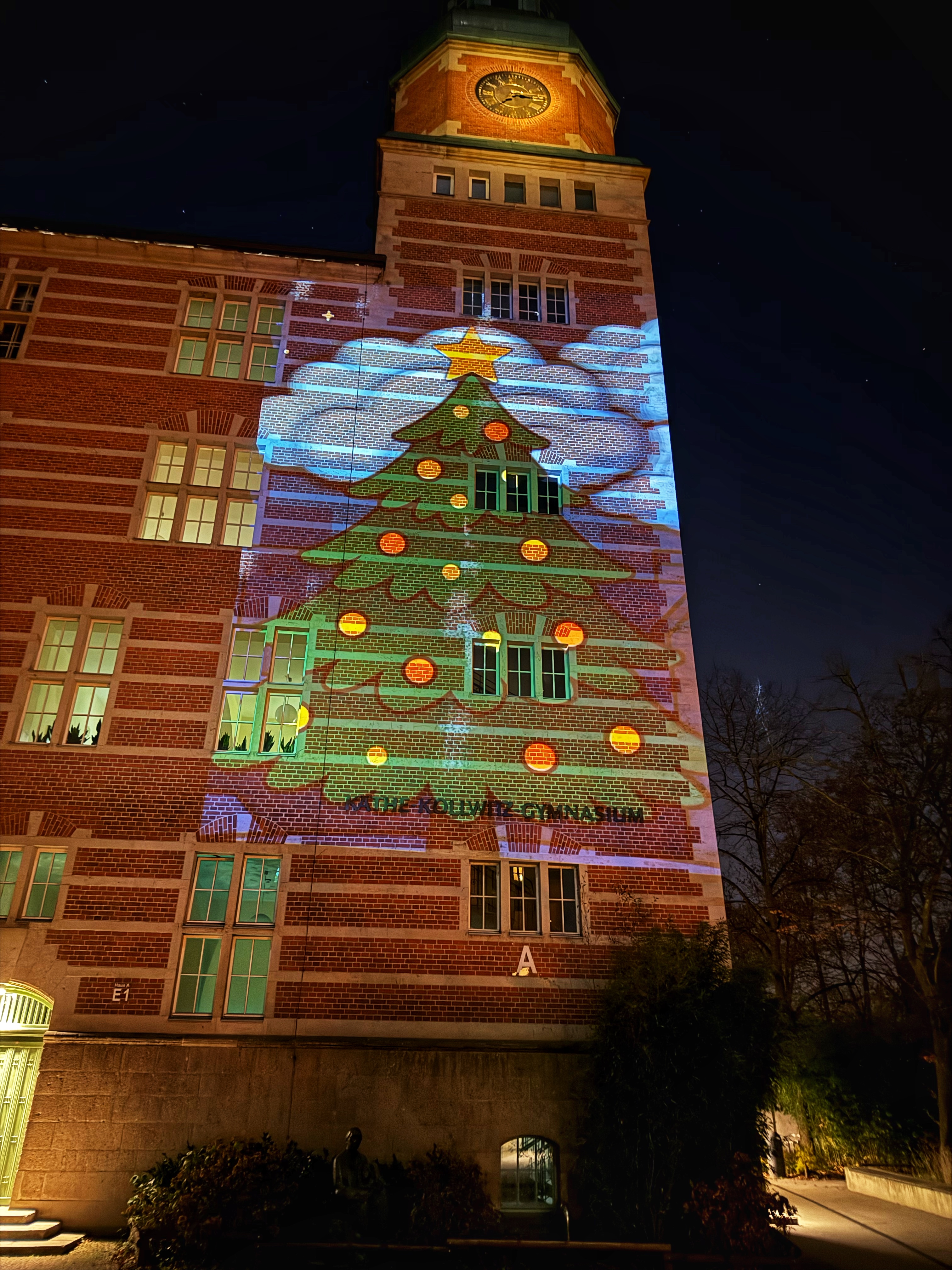 In der Adventszeit sind die Filme von Montag bis Freitag zwischen 17:00 Uhr und 19:30 Uhr an der Fassade des denkmalgeschützten Gebäudes zu sehen. Bereits am ersten Abend blieben viele Fußgänger, insbesondere Kinder mit ihren Eltern stehen und bewunderten die vielfältigen kurzen Clips, die alle etwas mit unseren mathematisch-naturwissenschaftlichen Profil zu tun.