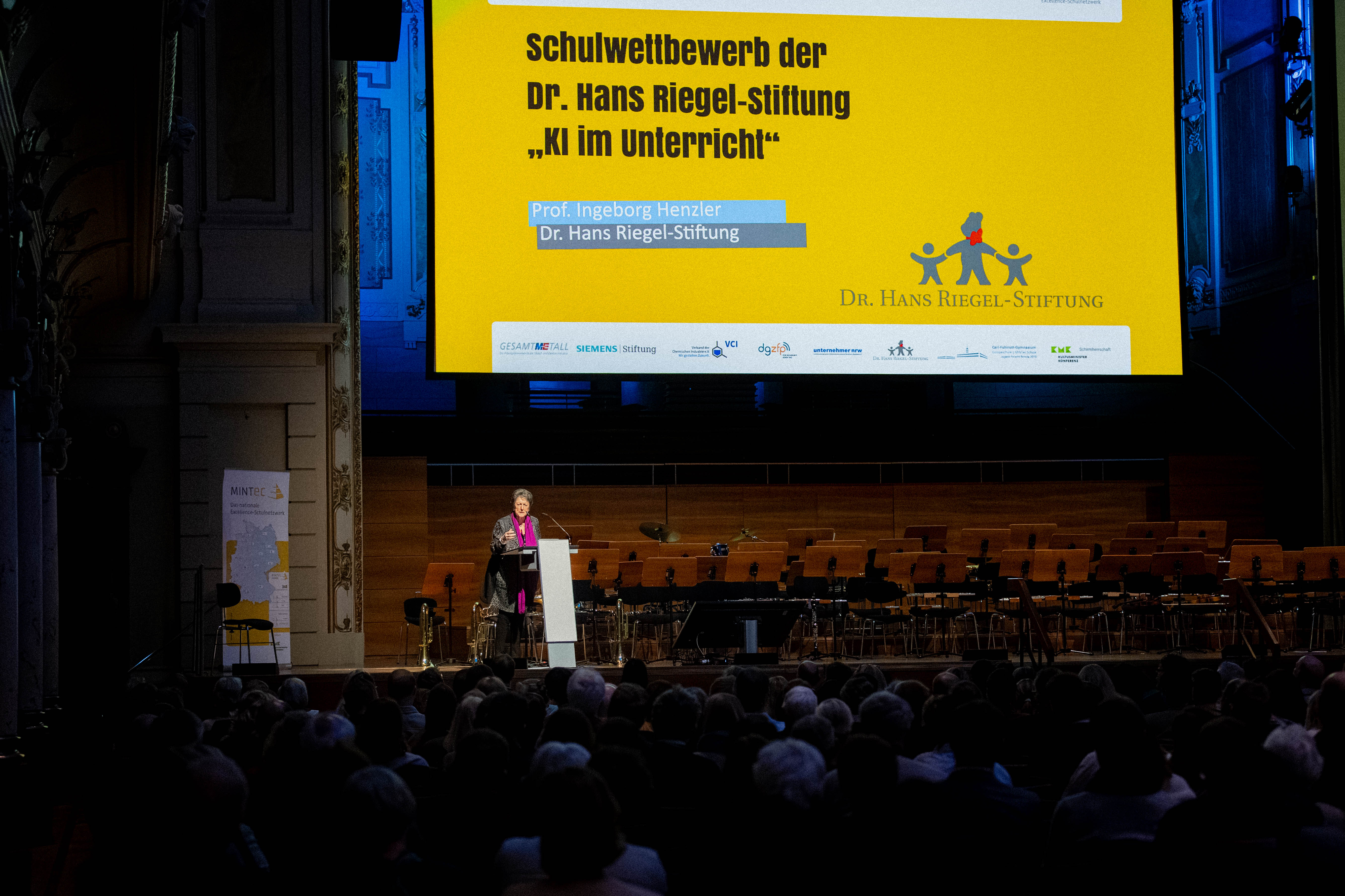 Unter dem Motto „Künstliche Intelligenz im Unterricht“ hatte sich Frau Dr. Ziomkowska mit ihrem Projekt „scienceCLASH – KI trifft Neurobiologie“ beworben. Gemeinsam mit den Schüler:innen Nuri (Q1), Helene und Till (Q3) präsentierte sie die Projektidee am Freitag auf der Bühne der Tagung. Nach einer Vorauswahl durch die Fachjury standen noch fünf Schulen im Finale. Unser Team überzeugte sowohl die Jury als auch das Plenum der rund 350 anwesenden Schulleiter:innen, und wurde am Samstag schließlich zu den bundesweiten Gewinnern erklärt. Die Dr. Hans Riegel-Stiftung fördert das Projekt mit 7000 € nun im kommenden Jahr, wodurch „scienceCLASH“ als innovatives Format der Wissenschaftskommunikation aus der Schule weiterentwickelt werden kann.