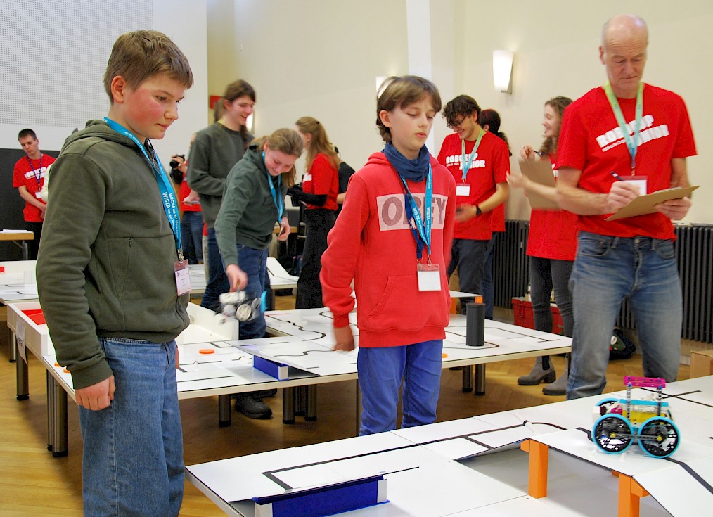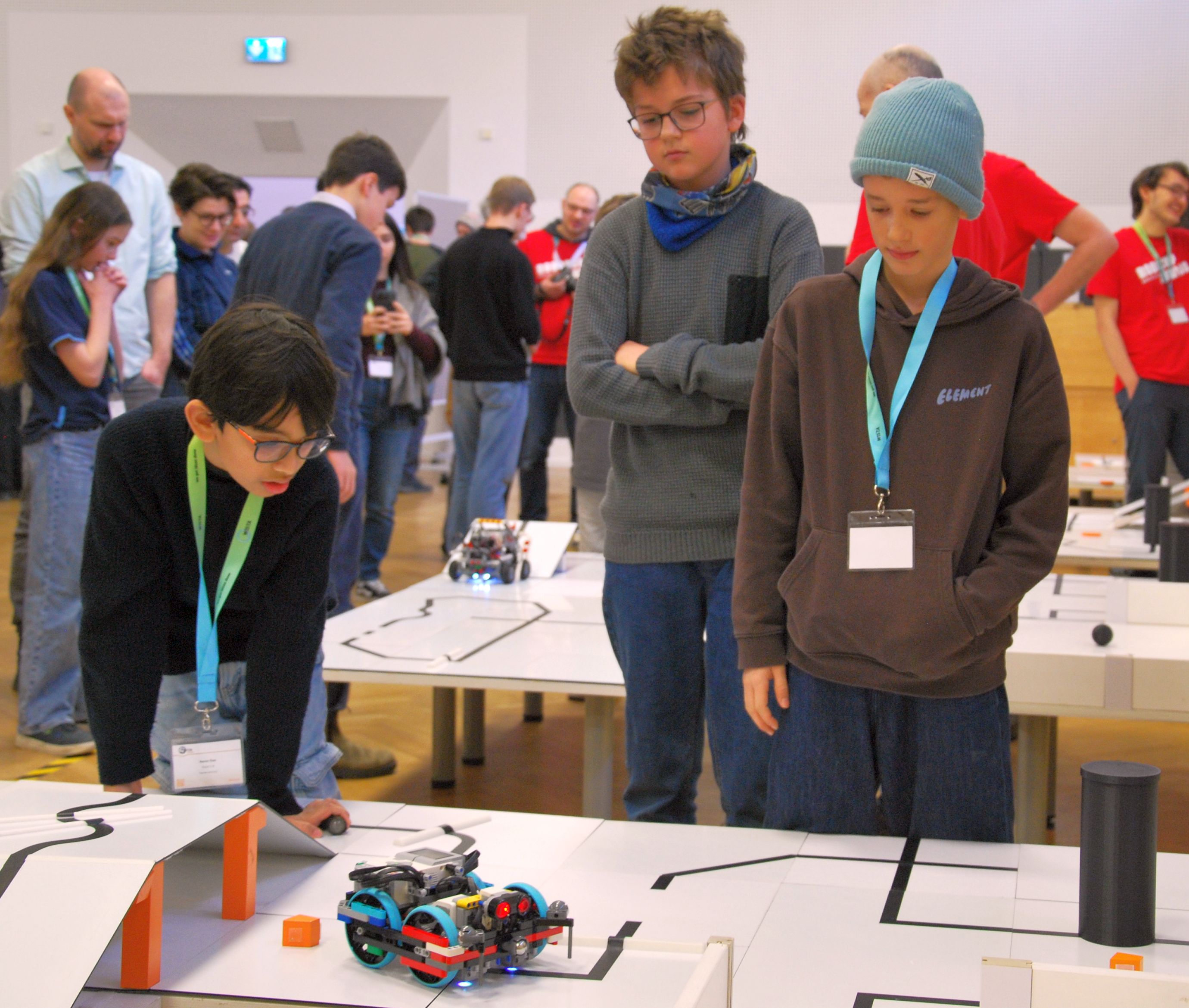 Am Wochenende kamen über 70 Schülerteams aus sechs Bundesländern in das Wista-Technologiezentrum in Berlin-Adlershof, um zu ermitteln, welche selbst konstruierten und programmierten Roboter die in vier Wettbewerbskategorien (Rescue, Soccer, Maze und OnStage) gestellten Aufgaben am besten lösen können. Aus dem Käthe-Kollwitz-Gymnasium waren diesmal 31 Schüler*innen mit 10 Teams am Start. Sie wurden von Herrn Kreutel, Herrn Abend und unseren studentischen Werkstattleitern Max, Jakob und Luca betreut, sowie von zahlreichen Eltern unterstützt.