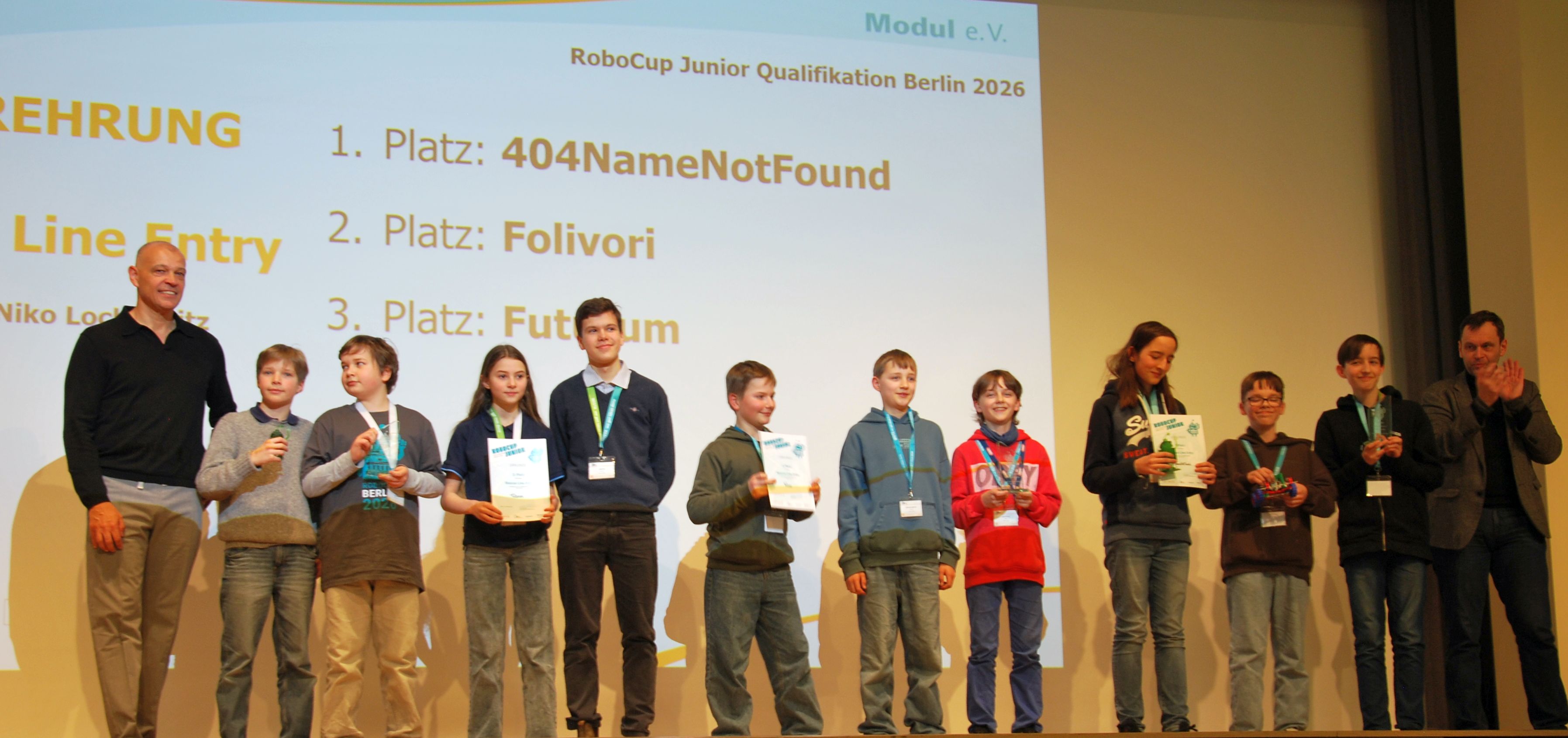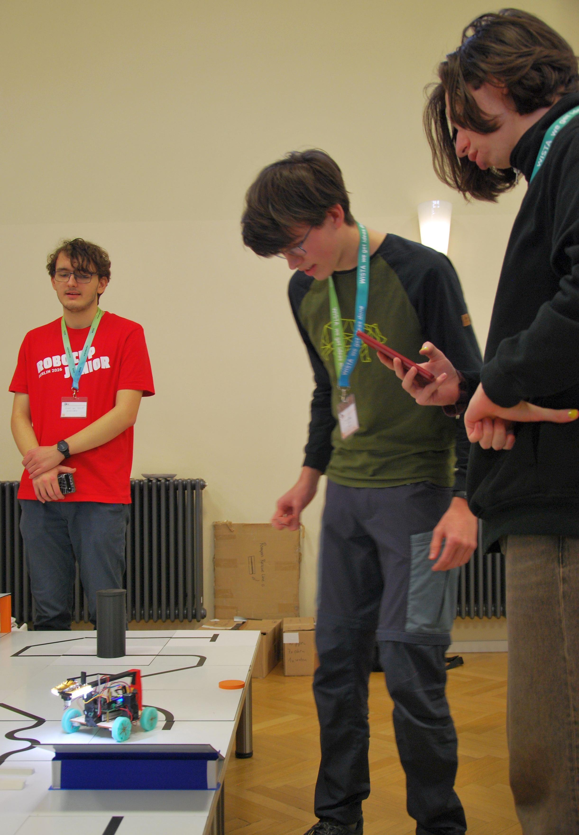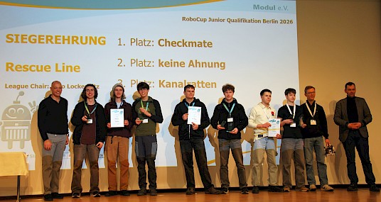 Leider haben auch zwei unserer Teams dem z.T. selbst erzeugten Erfolgsdruck, bzw. wegen auftretender Probleme dem Wettbewerb nicht standgehalten. Sie traten am zweiten Tag gar nicht mehr an. Das war sehr schade! Alle anderen Schüler*innen haben jedoch überzeugt und gute Ergebnisse mit ihren Robotern erzielt. Bei der Siegerehrung durften schließlich das Team 'Folivori' (dt. Faultiere) über ihren gar nicht faulen, sondern spitzenmäßigen zweiten Platz in der Liga 'Rescue-Line-Entry' jubeln. Kolja, Erik und Luca aus der Klasse 7.4 sind erst zum ersten Mal dabei und dabei schon so erfolgreich, Herzlichen Glückwunsch!